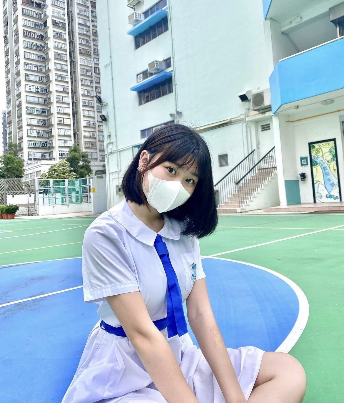 교복을 입고 벤치에 앉아 있는 아라페드 아시아 여성 - SeaArt AI
