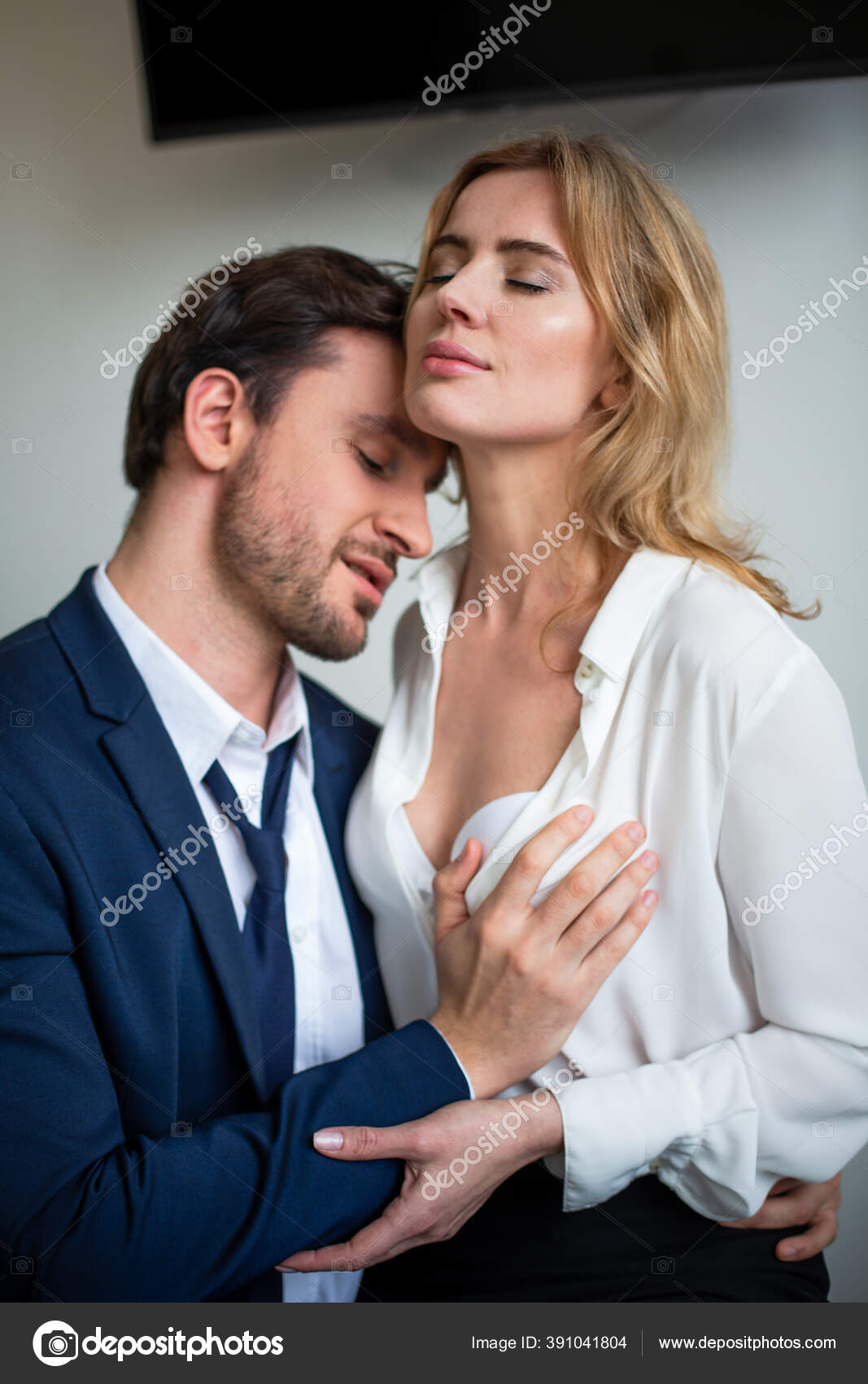 Деловые люди с удовольствием закрывают глаза, флиртуя в офисе. Мужчина трогает ж